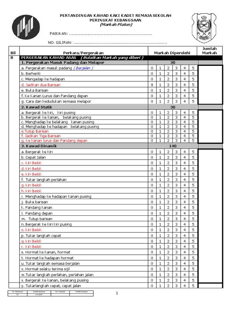 Ke belakang pusing semasa perlahan. Borang pemarkahan pertandingan kawad kaki sispa hanya untuk hakim sahaja 4 11 310. Borang Markah Kawad Xls Pdf Document from demovdocumentssite Borang pemarkahan pertandingan syarahangiliran pesertakategori.