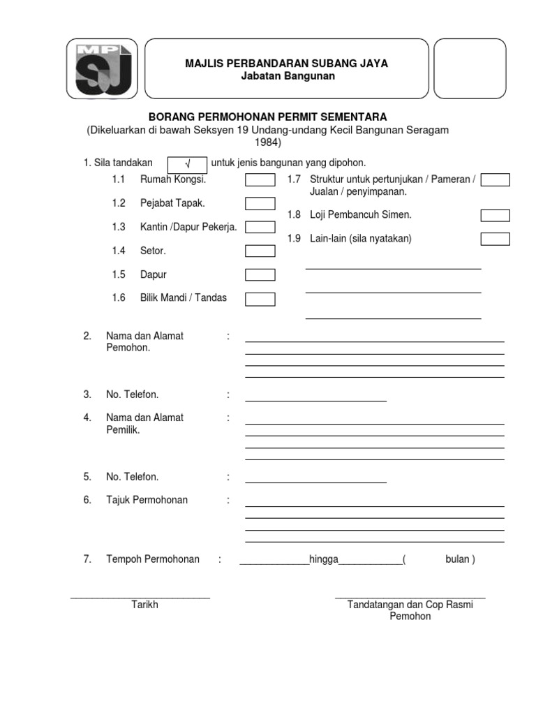 Majlis Bandaraya Subang Jaya tidak akan bertanggungjawab keatas sebarang kerosakan di atas penggunaan apa jua. Jabatan Kejuruteraan diketuai oleh Tuan Haji Shaiful Nor Aidil bin Mohd Jaya dengan dibantu oleh 138 orang kakitangan dibawah beliau. MBSJSPBPTKPLES-02RK01 - Borang Permohonan Lesen Hiburan Tempat Hiburan.