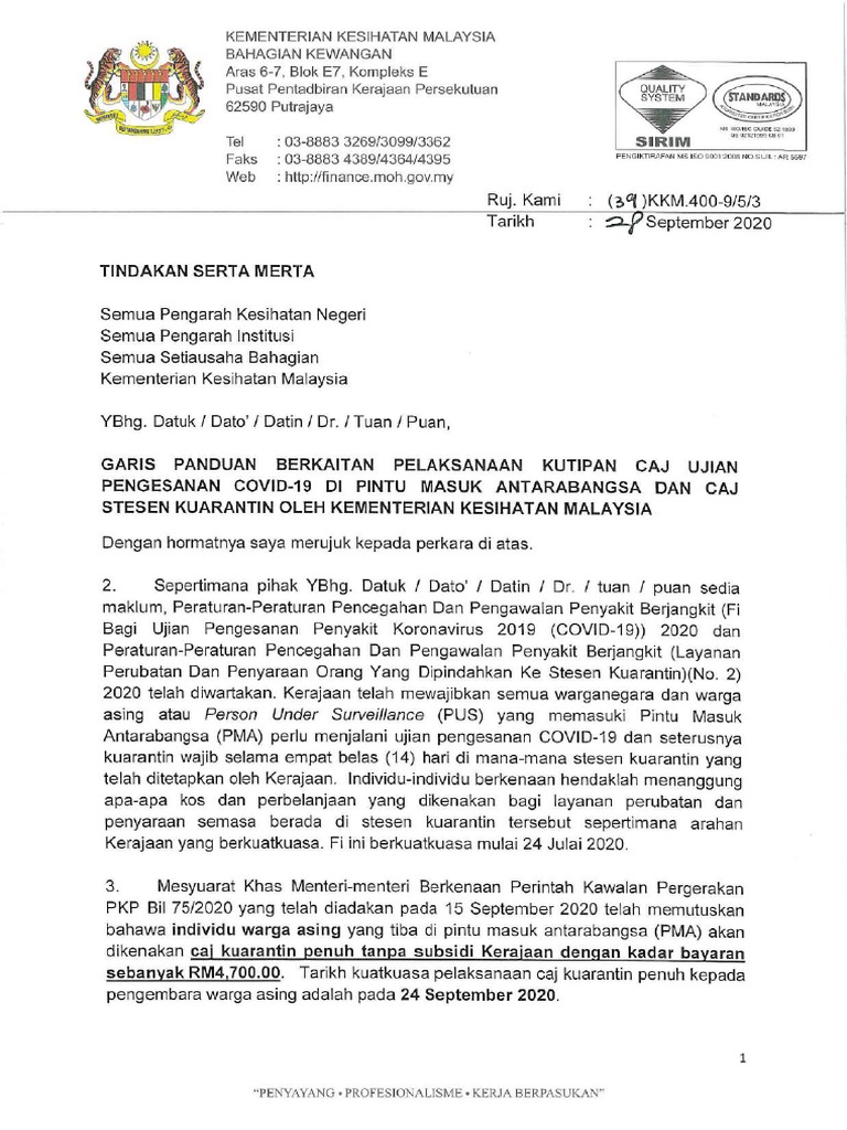 Garispanduan Caj Ujian Covid 19dancaj Kuarantin 28092020 Pdf