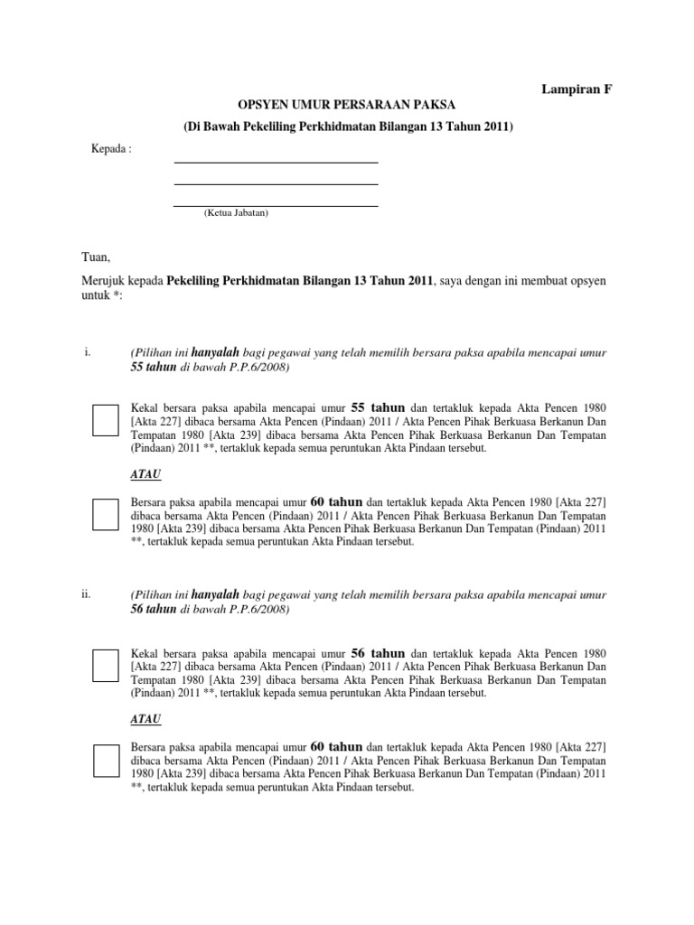 OPSYEN UMUR PERSARAAN PAKSA Di Bawah Pekeliling Perkhidmatan Bilangan 11 Tahun 2011 Lampiran F Ketua Jabatan Tuan Merujuk kepada Pekeliling Perkhidmatan Bilangan 11 Tahun 2011 saya dengan ini membuat opsyen. Tempoh perkhidmatan 2 tahun di jawatan pembantu tadbir perkeranian operasi gred n22 boleh diambil kira. Saya sokong kerajaan naikkan had umur persaraan hingga 60 tahun.