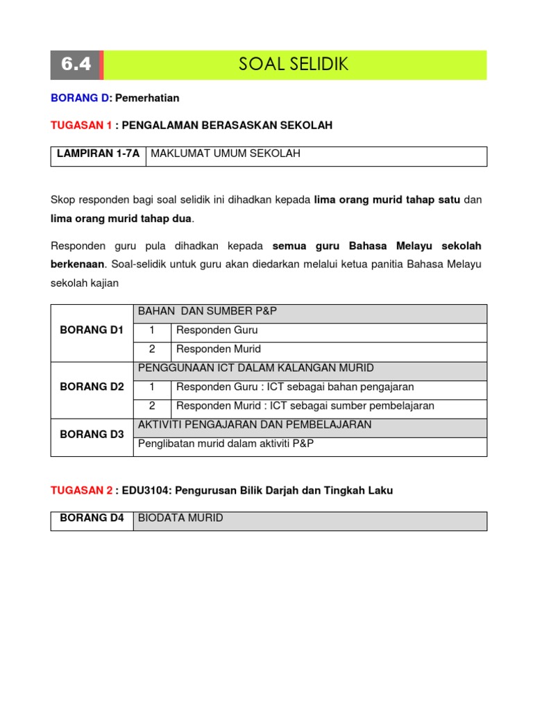 Borang soal-selidik telah digunakan sebagai instrument kajian. Related Posts To Contoh Borang Soal Selidik Pengajaran Dan Pembelajaran Contoh Borang Soal Selidik Pengajaran Dan Pembelajaran 2017-12-26T085800-0800 Rating. BORANG SOAL SELIDIKPERSEPSI GURU-GURU TERHADAP KONSEP SEKOLAH BESTARIPENGENALANBorang soal selidik ini digunakan untuk membuat kajian terhadap persepsi guru-guru tentang konsep sekolah bestari yangdiilhamkan oleh Kementerian Pelajaran Malaysia.